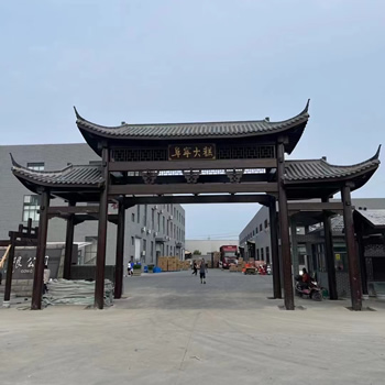 這個(gè)是工業(yè)區(qū)定制的一個(gè)古建牌樓牌坊,下面是防腐木材料 ,上面蓋的小青瓦,這種仿古牌樓牌坊也經(jīng)常在景區(qū)里可以看到。
